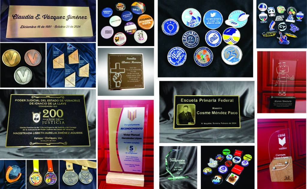 Empresa 100% mexicana que desde hace más de 80 años nos dedicamos a hacer Pines, Diplomas, Grabado en Vidrio, Medallas, Llaveros, Gafetes, Reconocimientos, Placas Conmemorativas, Placas para maquinaria, Placas de Bronce y Aluminio, Fotobotones, y más…